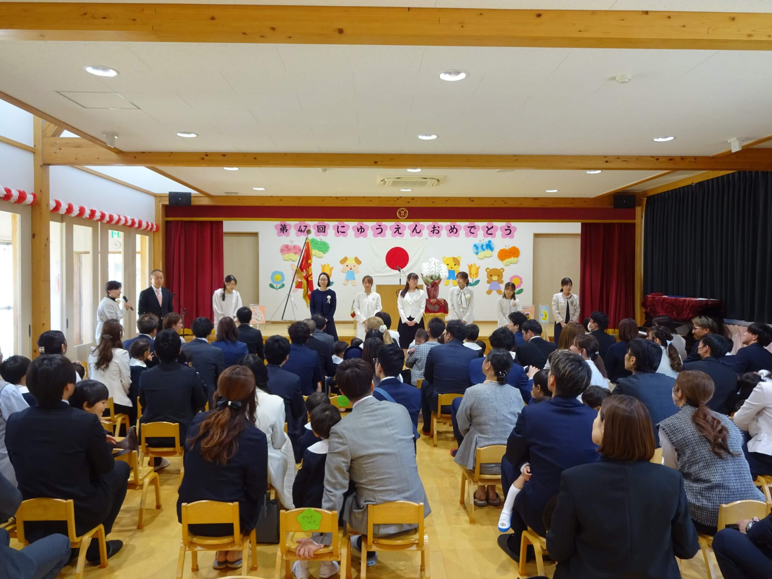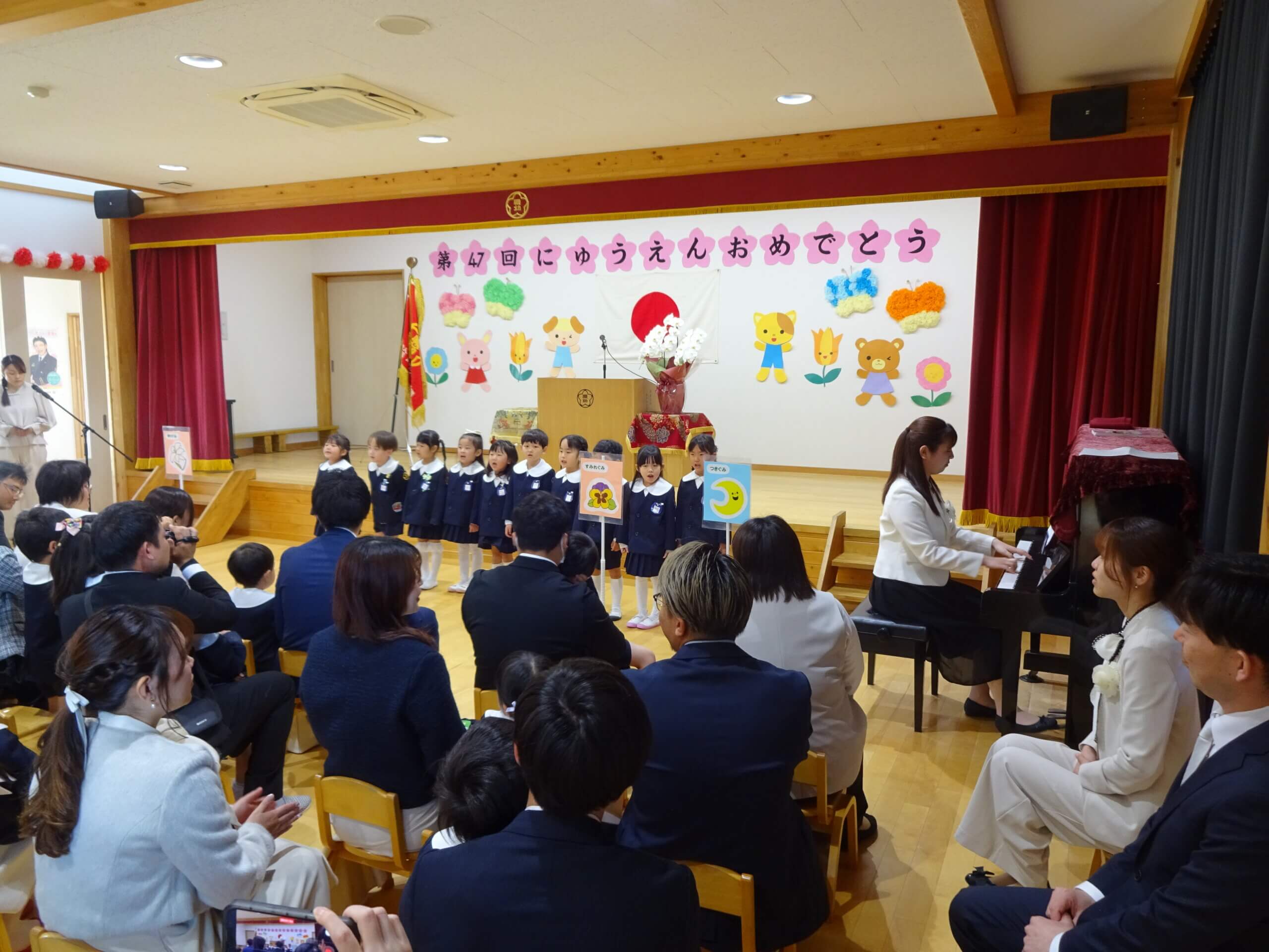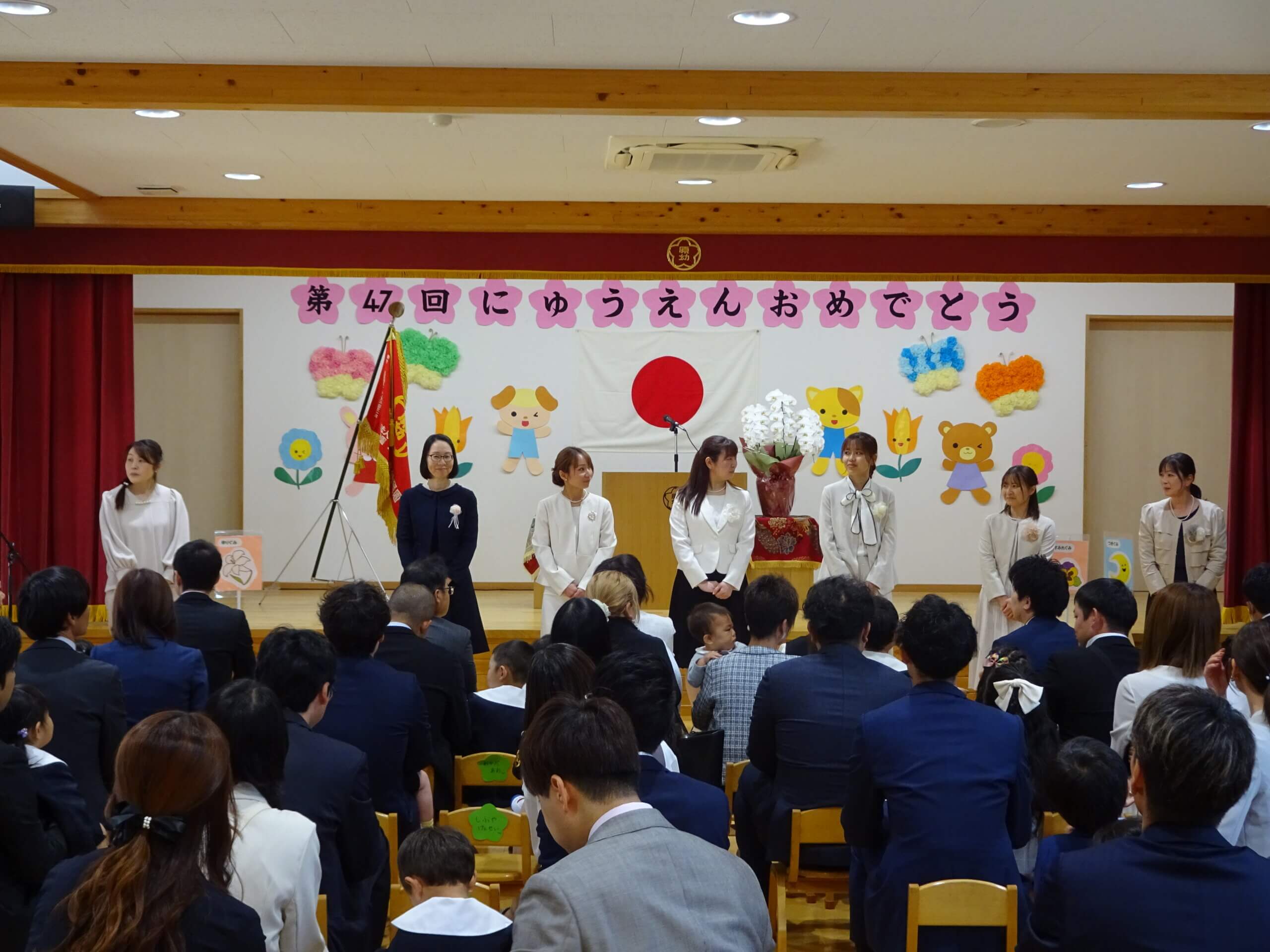 はじめに阿部園長の挨拶、そして在園児たちによる挨拶や園歌の合唱で新入園児を歓迎しました。